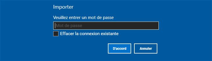 - Entrez le mot de passe Mawashi-Geri puis cliquez sur D’accord sans cochez la case « Effacer la connexion existante »
